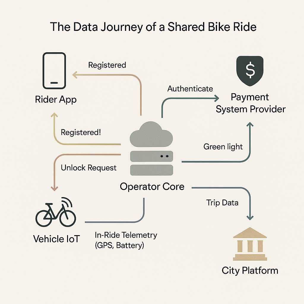 Picture this: You're late for a meeting and there is a public transit strike. You pull out your phone, find a shared-bike station a block away, and register with your city’s bikeshare App. You scan the QR code. The lock clicks open and you start pedaling. In that two-minute interaction, you've just initiated a cascade of data across a handful of companies, a conversation that spans from the cloud to the curb.